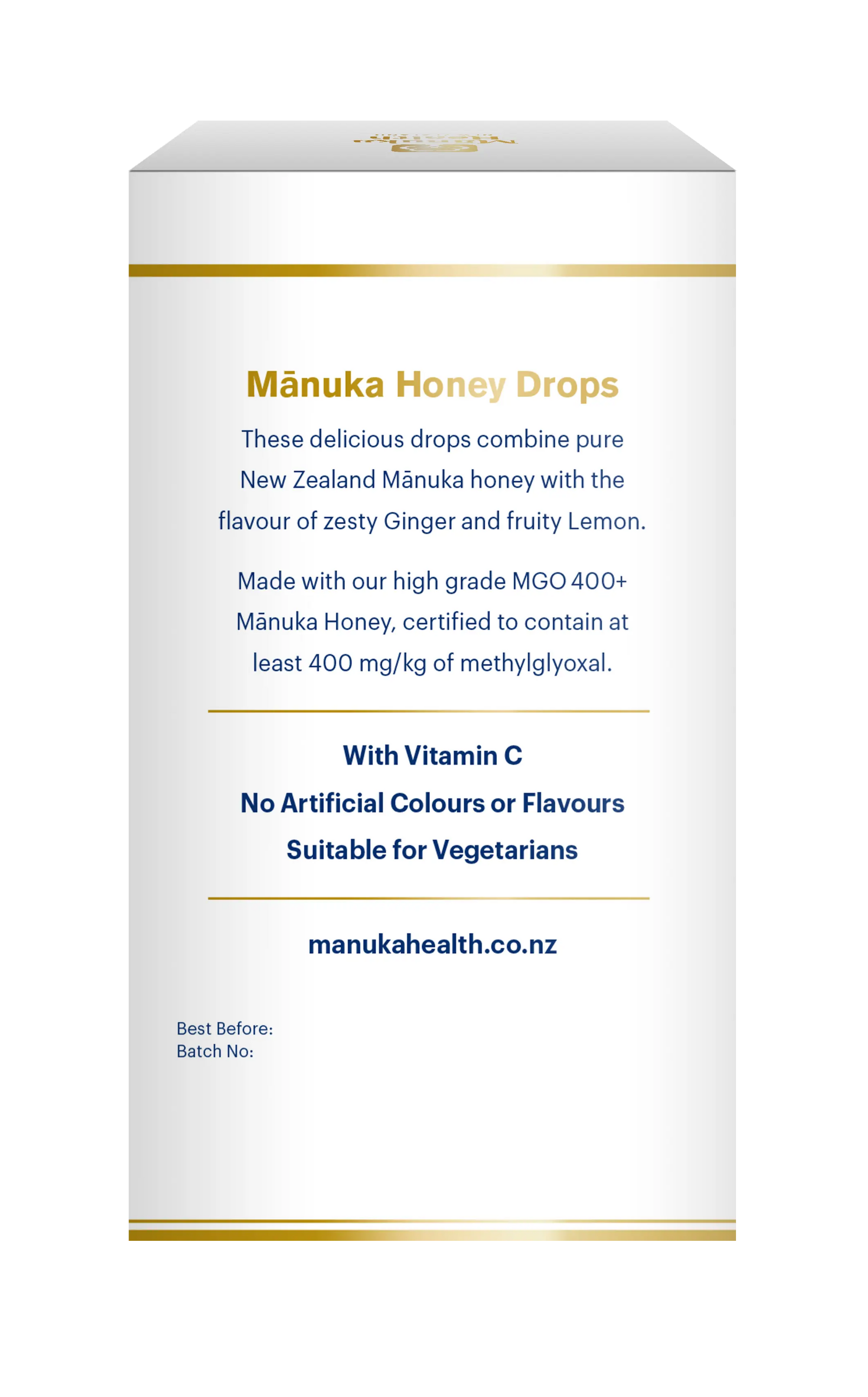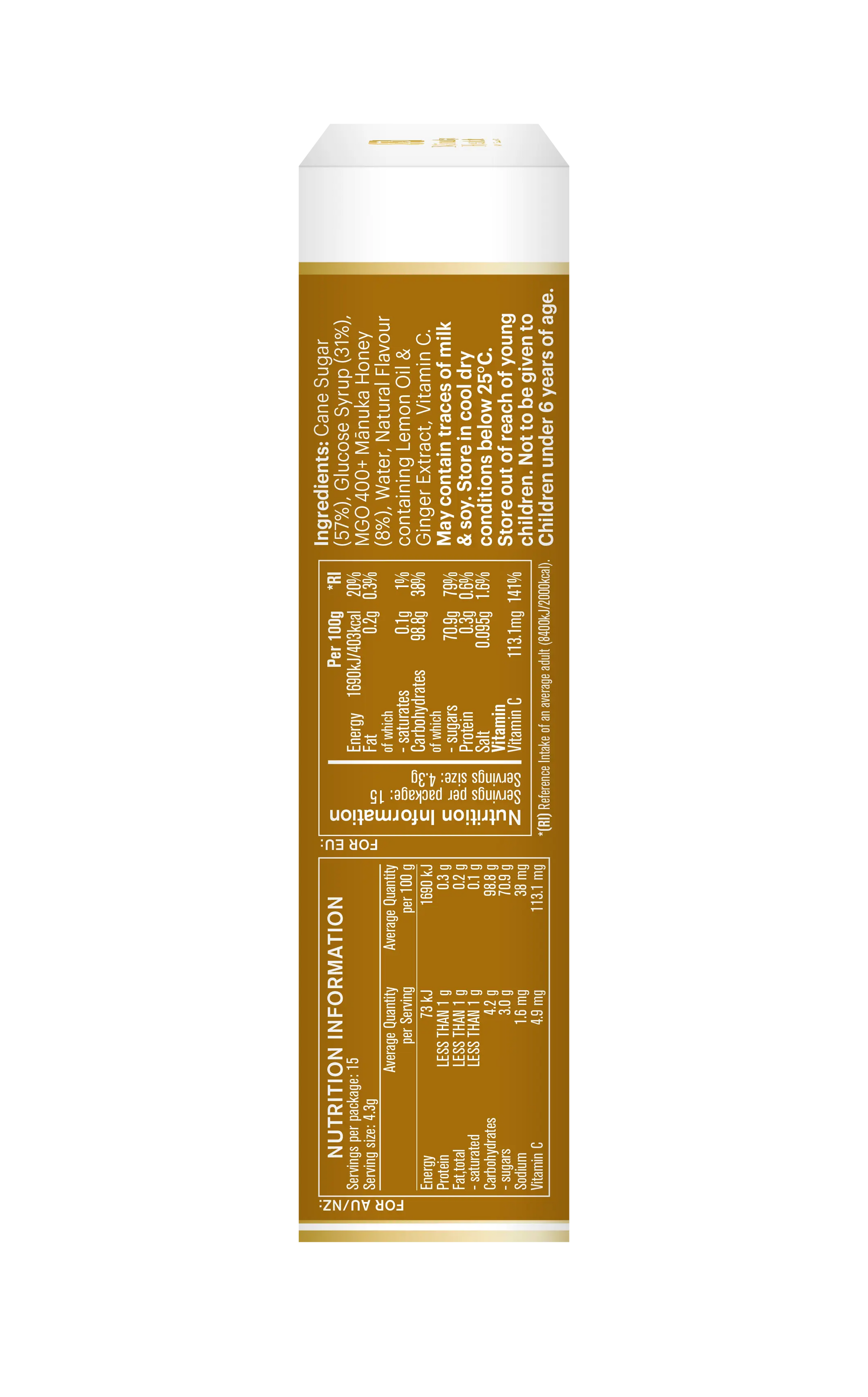 Cane Sugar, Glucose, MGO400+ Manuka Honey (8%, 344mg), Water, Natural Lemon Oil, Natural Ginger Extract, Vitamin C.